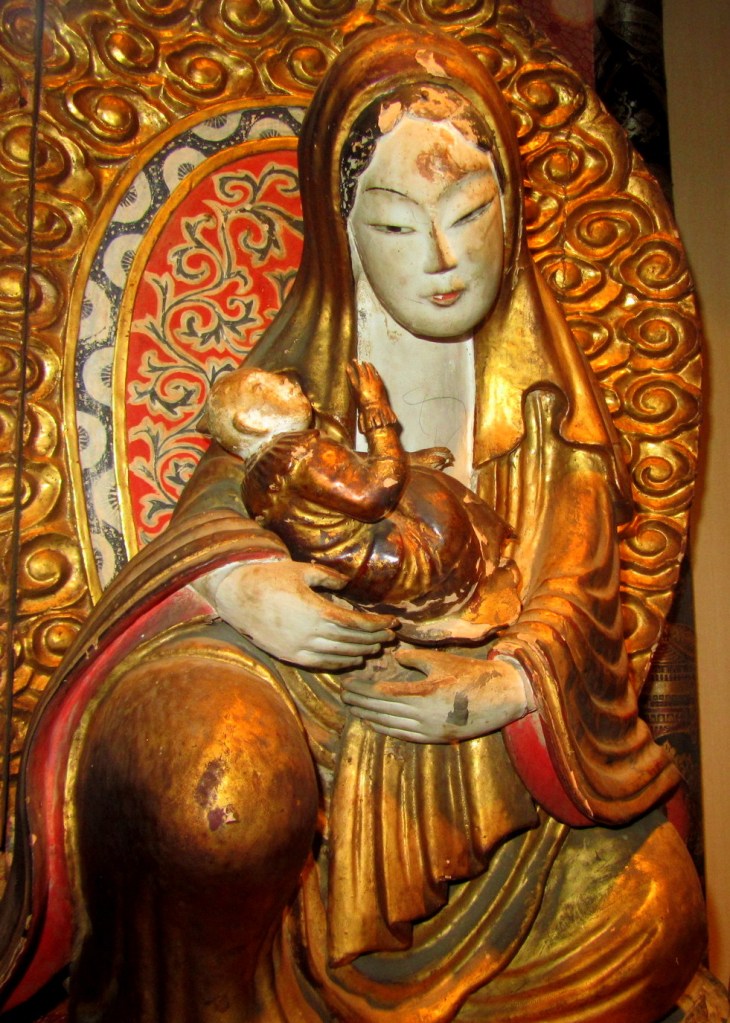Above is the Maria Kannon with child. Kannon, the Buddhist Goddess of Mercy, takes the place of the Virgin Mary. The child in her arm is detachable, thus if the authorities were inspecting a home with this statue on display, the said Christian could remove the child and just state this is a statue of Kannon. But in prayer, the child would be reattached and the statue be viewed as Mary and Jesus.