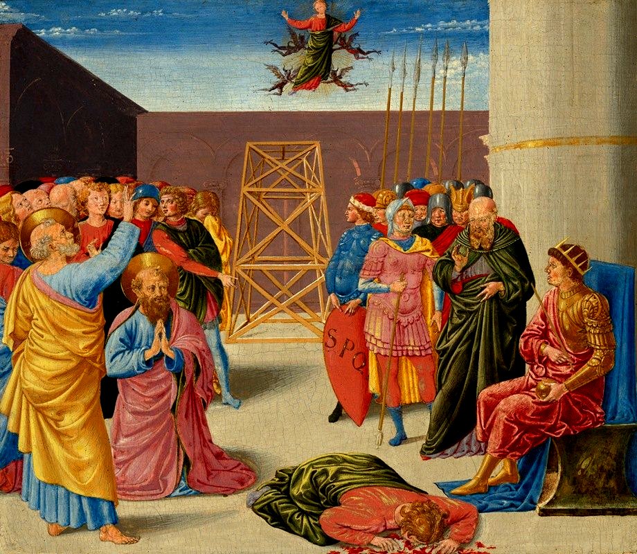 Simon said: "Listen, O Cæsar Nero, that you may know that these men are liars, and that I have been sent from the heavens: tomorrow I go up into the heavens, that I may make those who believe in me blessed, and show my wrath upon those who have denied me." Peter and Paul said: "Us long ago God called to His own glory; but you, called by the devil, hasten to punishment." Simon said: "Cæsar Nero, listen to me. Separate these madmen from you, in order that when I go into heaven to my father, I may be very merciful to you." Nero said: "And whence shall we prove this, that you go away into heaven?" Simon said: "Order a lofty tower to be made of wood, and of great beams, that I may go up upon it, and that my angels may find me in the air; for they cannot come to me upon earth among the sinners." Nero said: "I will see whether you will fulfil what you say." Then Nero ordered a lofty tower to be made in the Campus Martius, and all the people and the dignities to be present at the spectacle. And on the following day, all the multitude having come together, Nero ordered Peter and Paul to be present, to whom also he said: Now the truth has to be made manifest. Peter and Paul said: "We do not expose him, but our Lord Jesus Christ, the Son of God, whom he has falsely declared himself to be." And Paul, having turned to Peter, said: "It is my part to bend the knee, and to pray to God; and yours to produce the effect, if you should see him attempting anything, because you were first taken in hand by the Lord." And Paul, bending his knees, prayed. And Peter, looking steadfastly upon Simon, said: "Accomplish what you have begun; for both your exposure and our call is at hand: for I see my Christ calling both me and Paul." Nero said: "And where will you go to against my will?" Peter said: "Whithersoever our Lord has called us." Nero said: "And who is your lord?" Peter said: "Jesus the Christ, whom I see calling us to Himself." Nero said: "Do you also then intend to go away to heaven?" Peter said: "If it shall seem good to Him that calls us." Simon said: "In order that you may know, O emperor, that these are deceivers, as soon as ever I ascend into heaven, I will send my angels to you, and will make you come to me." Nero said: "Do at once what you say." Then Simon went up upon the tower in the face of all, and, crowned with laurels, he stretched forth his hands, and began to fly. And when Nero saw him flying, he said to Peter: "This Simon is true; but you and Paul are deceivers." To whom Peter said: "Immediately shall you know that we are true disciples of Christ; but that he is not Christ, but a magician, and a malefactor." Nero said: "Do you still persist? Behold, you see him going up into heaven." Then Peter, looking steadfastly upon Paul, said: "Paul, look up and see." And Paul, having looked up, full of tears, and seeing Simon flying, said: "Peter, why are you idle? Finish what you have begun; for already our Lord Jesus Christ is calling us." And Nero hearing them, smiled a little, and said: "These men see themselves worsted already, and are gone mad." Peter said: "Now you shall know that we are not mad." Paul said to Peter: "Do at once what you do." And Peter, looking steadfastly against Simon, said: "I adjure you, you angels of Satan, who are carrying him into the air, to deceive the hearts of the unbelievers, by the God that created all things, and by Jesus Christ, whom on the third day He raised from the dead, no longer from this hour to keep him up, but to let him go." And immediately, being let go, he fell into a place called Sacra Via, that is, Holy Way, and was divided into four parts, having perished by an evil fate.