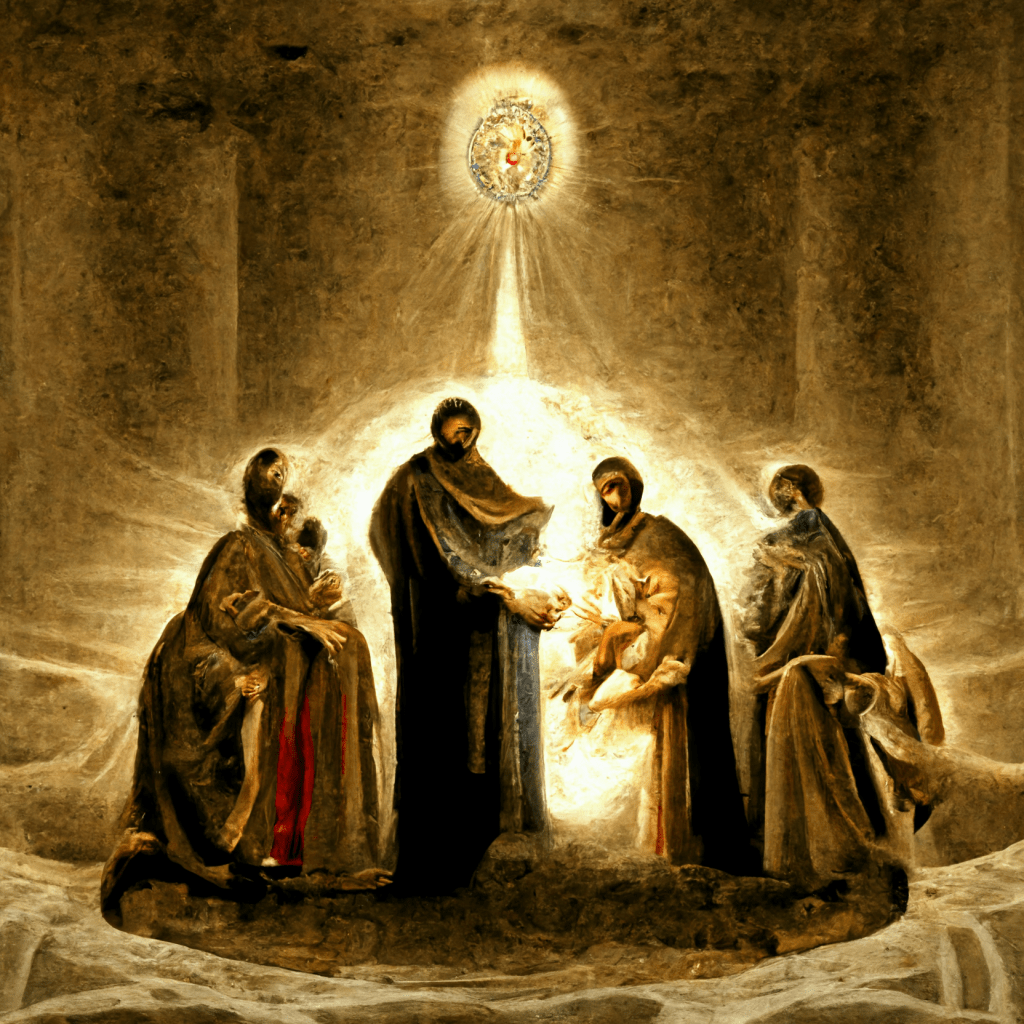 Here is another post with some MidJourney A.I. generated artwork. For these three variants of “the first source”, I used the opening section of the “Untitled text” from the Bruce Codex. I have spoken highly of this text before (it is one of my favorites) and was quite pleased with these results. As you can see with all three variants, they all have the same look to them but in different styles. I love how there is a central light/figure that then splits into various aspects. My favorite of the three is the main photo above, but the other two are really neat as well. I like how there are “garments” that lay on the floor next to the figures on that main photo. That type of imagery is present throughout numerous gnostic texts in that you must shed your worldly garment (flesh suit, if you will) to ascend to the pleroma.