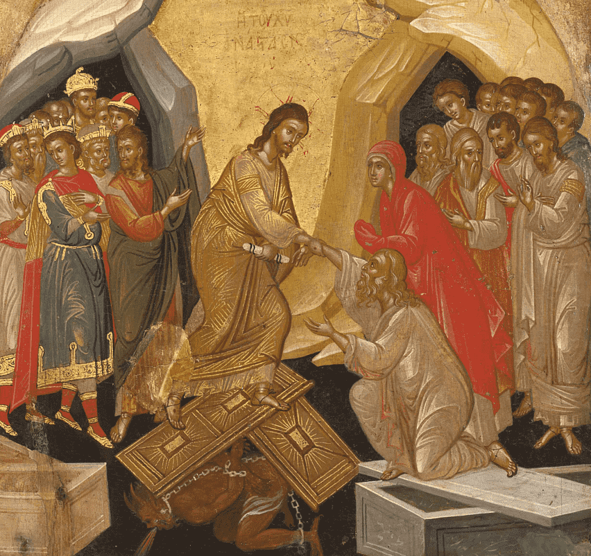 Chapter 8 has Christ raising Adam from the underworld as well as the other saints and prophets. Pictured above is an icon of that scene and it is quite a popular icon in the Eastern Orthodox tradition. Below the feet of Christ is the broken down gates of Hades.