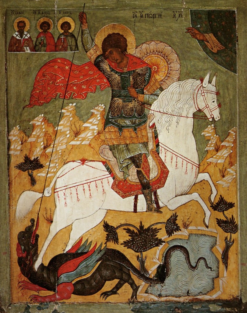 St. George iconography is traditional artwork. The other artwork featured on the post is from the klosterneuburger evangelienwerk, which can be viewed online at: https://www.e-codices.unifr.ch/en/searchresult/list/one/sbs/0008