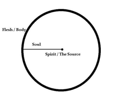 The middle point represents the SPIRIT of the source. The line (be it a literal line or invisible) from the point to the circle represents the SOUL. The circle would represent the material matter, i.e. the FLESH. These three concepts make up the human being. But it also makes up the path of which one has to partake in life. Instead of looking at it from the center outward, start from the circle and look inward. The FLESH is our material world. This is where we live our daily lives. Within us is our SOUL. This would be our consciousness, whether this is an individual aspect or part of a collective one. The source, or the SPIRIT, is the true originator, the SOURCE to which we constantly yearn to become one with once again. This road map shows us that we must become aware of our soul to find the path to the spirit. Once this DIVINE LIGHT is shown to us, we have our destination in which we are to go towards.