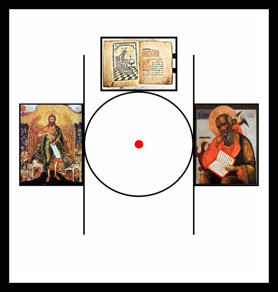 The point within a circle surrounded by two parallel lines, John the Baptist on the left and John the Evangelist / Theologian on the right, and the Holy Scriptures on top has many meanings behind it. A simplistic viewpoint is that the point is the individual, the circle within the two lines, which act as a boundary to circumscribe our passions and keep us within due bounds to ourselves and all of mankind. The Saints surround the outside and the Holy Scripture on top, which itself is our guide of faith. But what does this mean? Everyone will have a different take on the interpretation, but this will be my opinion, take it however you will.