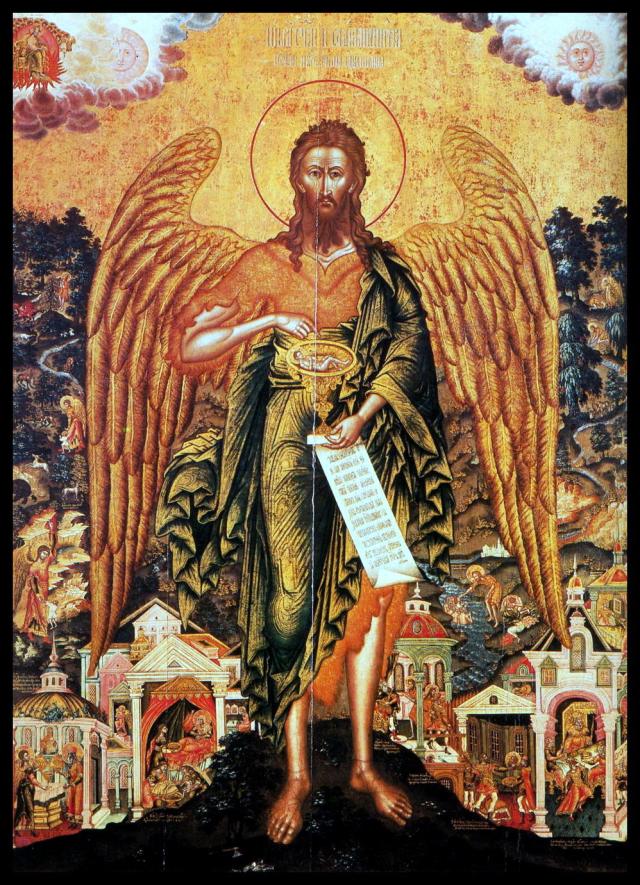 As for the figures surrounding the symbol, there is John the Baptist on the left and John the Evangelist / Theologian on the right, and the Holy Scripture at the top.